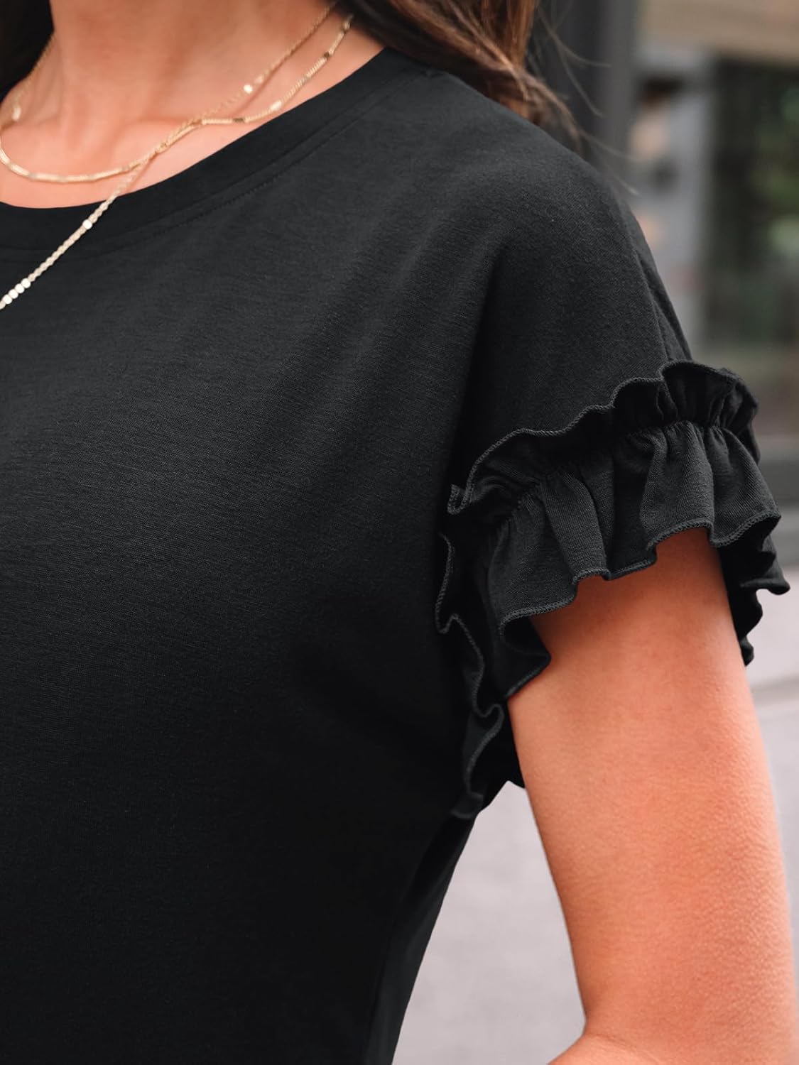 Customers love the shirt’s feminine ruffle detail on the sleeves and appreciate that it can be dressed up or down. The fit is true to size with a perfect length, and the fabric is soft and comfortable, with one customer noting it works well with jeans or work slacks. They like the fabric quality, with one mentioning it’s thick enough to hold up well, and find it easy to wear. Customers consider it good value for money.