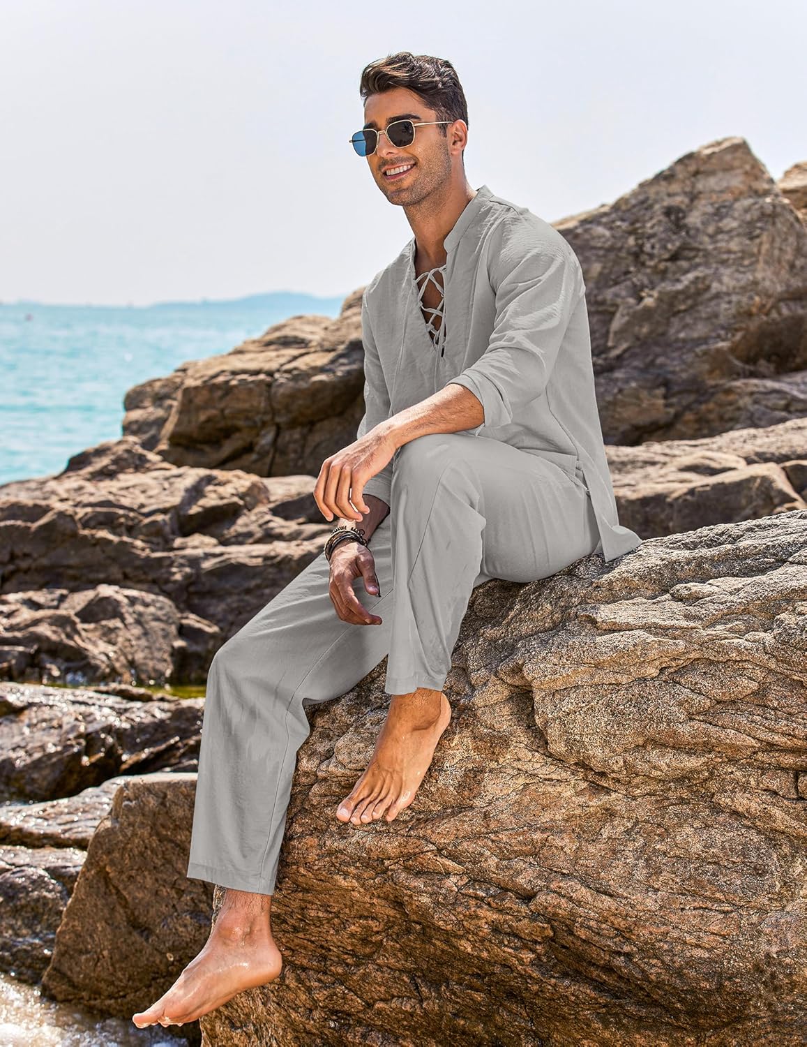 Men’s 2 Piece Linen Set Henley Shirts Casual Beach Pants Summer Yoga Outfits COOFANDY 2 Piece Set for men