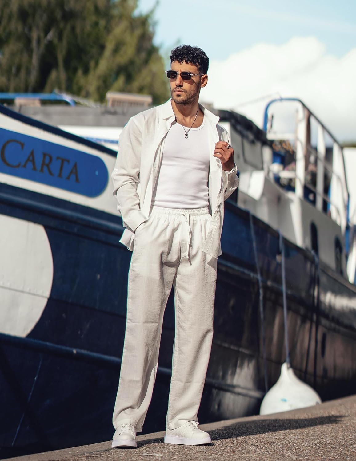 Get ready to set sail in style with this men’s cruise wear linen set. Its classic and elegant design will make you look stylish and sophisticated, while its versatility allows you to dress it up for various occasions.