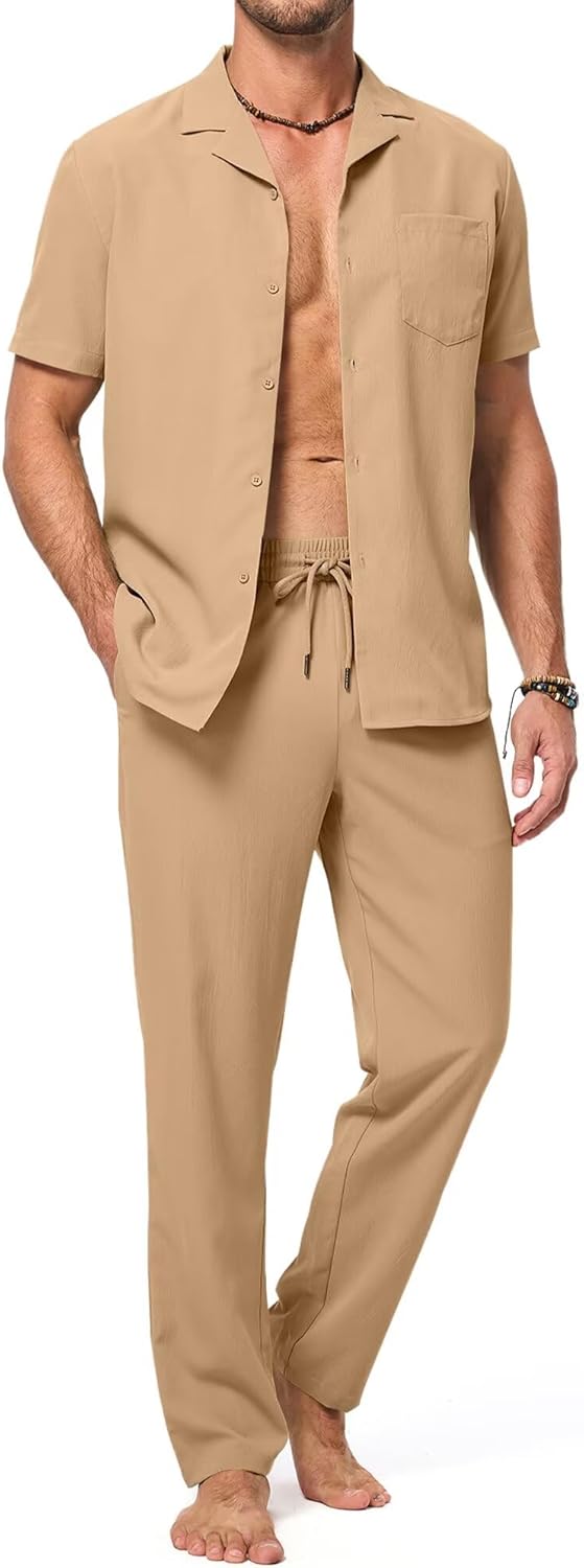 Men’s Beach Outfit 2 Piece Casual Button Down Shirt Short Sleeve Loose Shirts and Pants Vacation Sets for Men