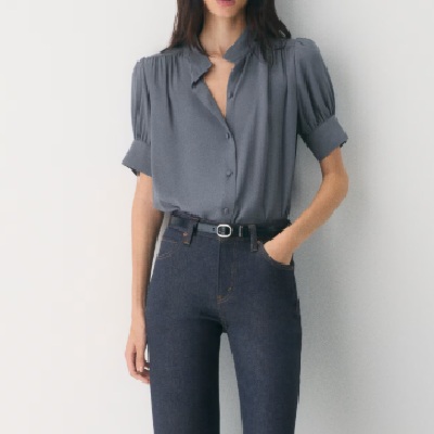 If you’re looking for a few more short-sleeved tops to get you through the last part of summer, Aritzia has a ton of great options. This button-up blouse has a gorgeous, drapey fabric made from 100% recycled material. I really like the covered buttons and slightly blousy sleeves.