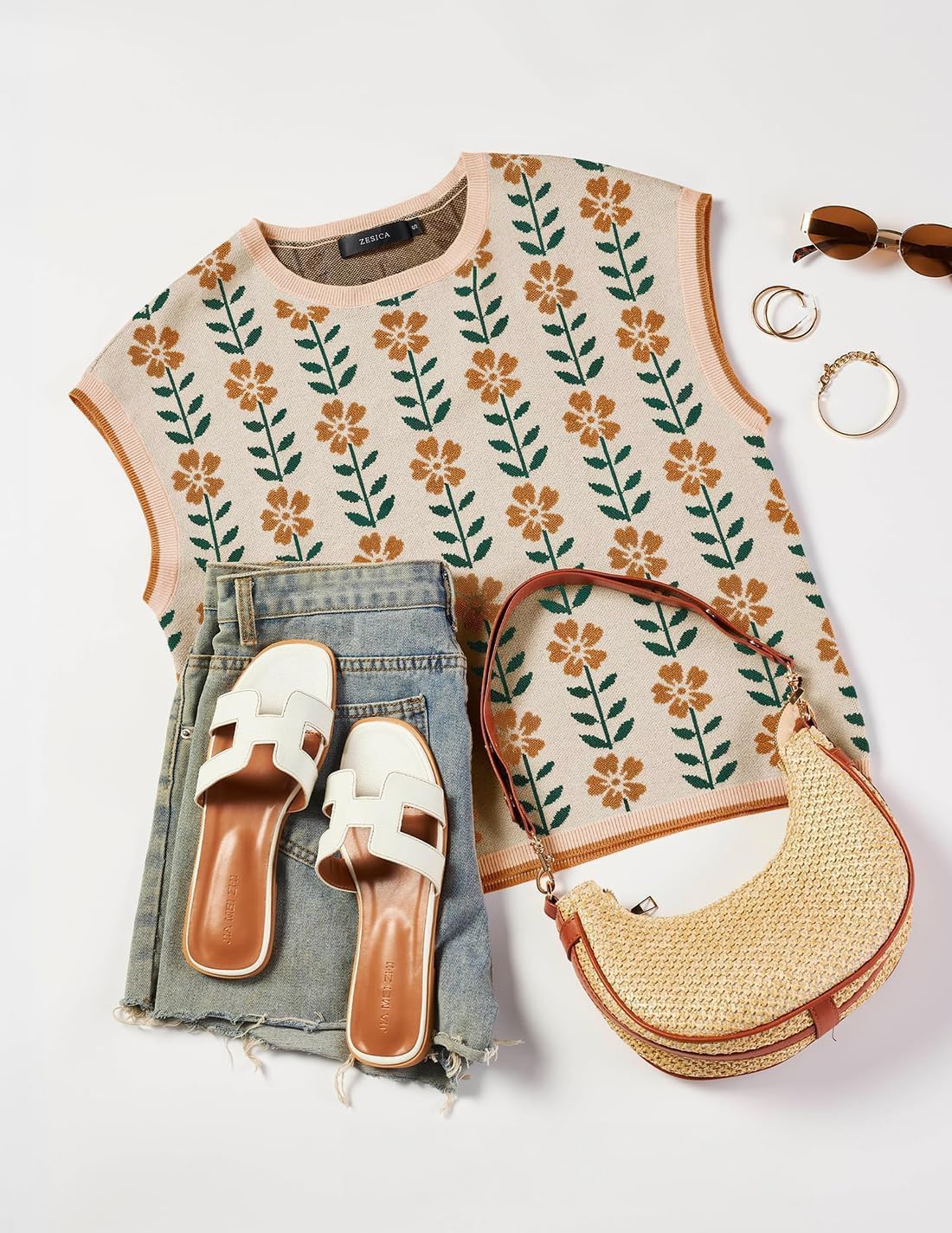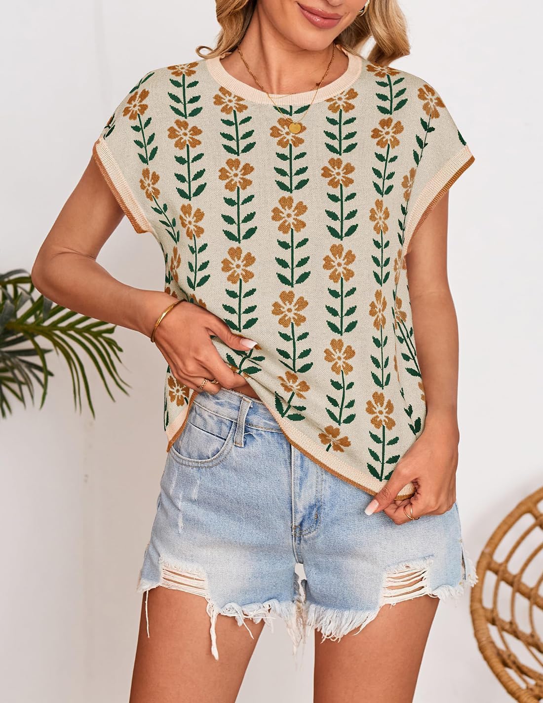 ZESICA Womens Short Sleeve Printed Tops Crew Neck Cute Knit Sweaters Vest 2025 Trendy Clothes Outfits