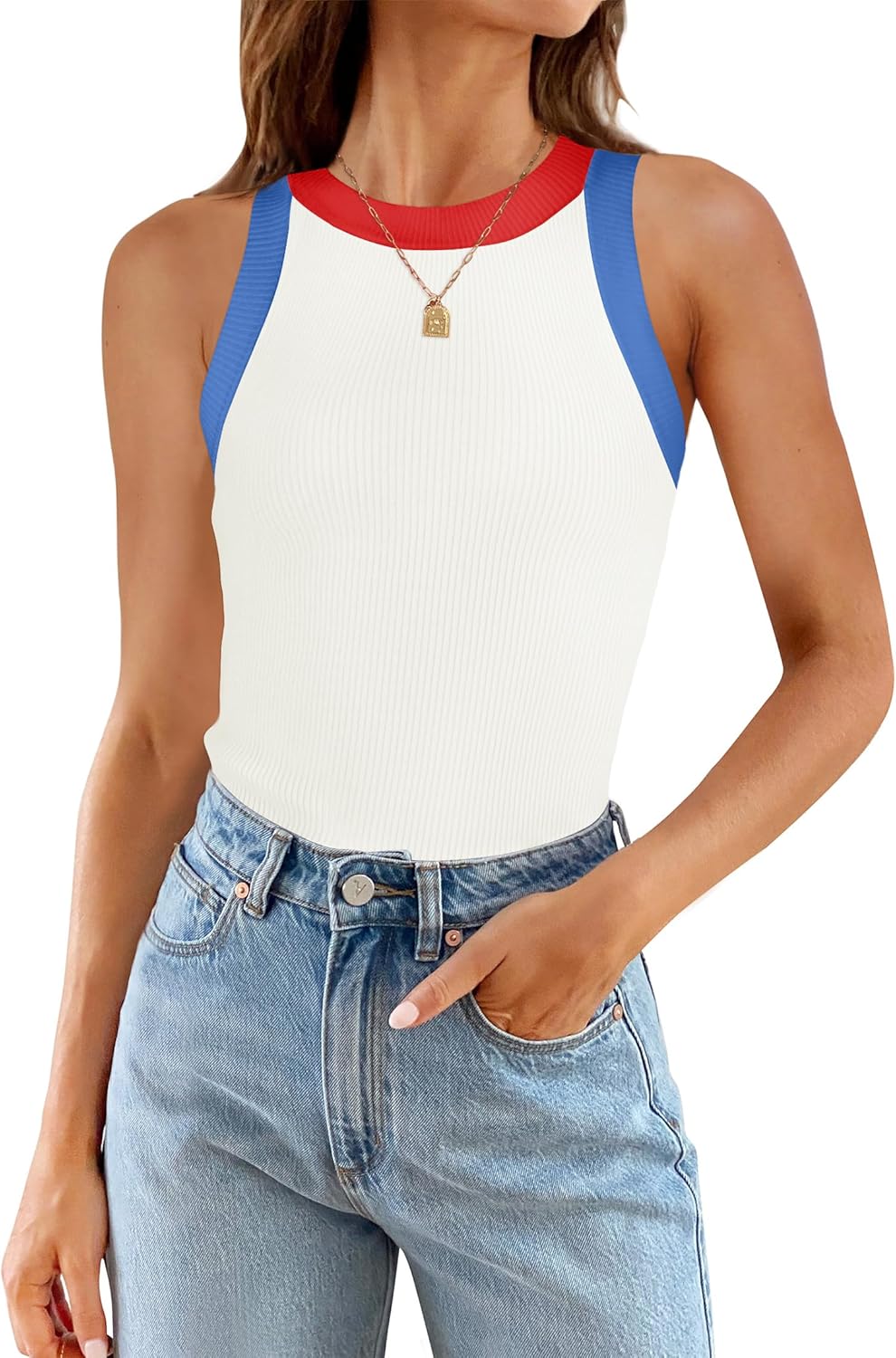 ZESICA Womens Summer Sleeveless Tank Tops Ribbed High Neck Racerback Slim Fitted Color Block Casual Shirts